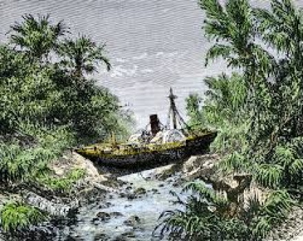 We forded the Koeripan River and then continued our journey upstream, along the right bank. Finally, after a very tiring hour's journey, we suddenly see a most extraordinary sight before us at a bend in the river: a large paddle steamer, completely undamaged, lies there, in the middle of the forest, like a bridge over the river, which flows peacefully under its keel over a bed of wide black pebbles.